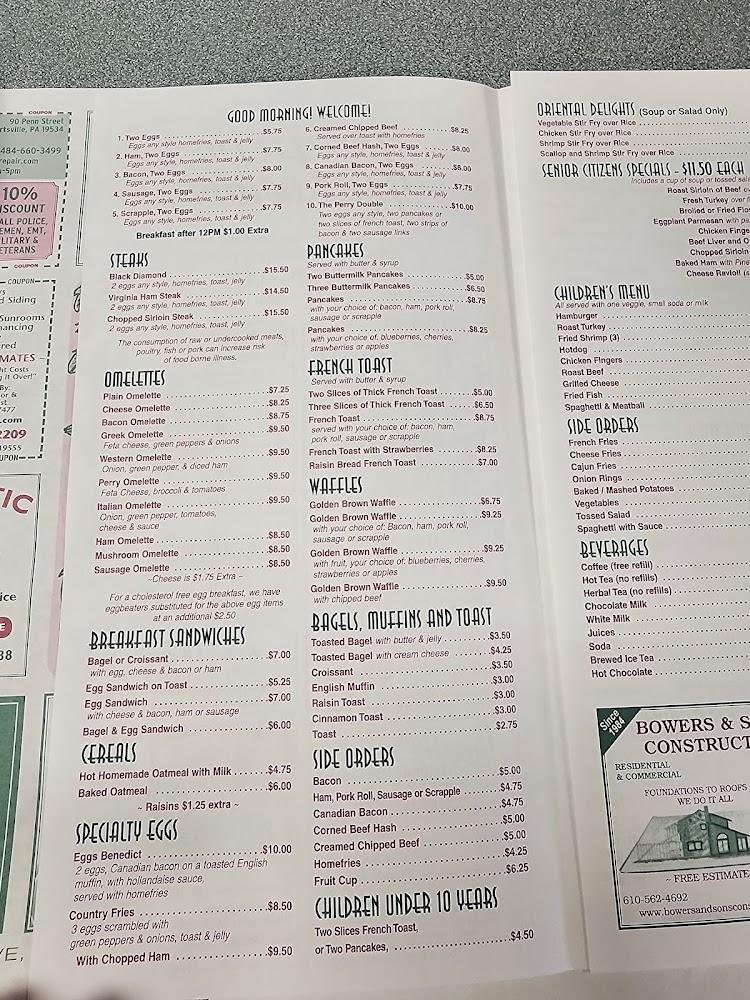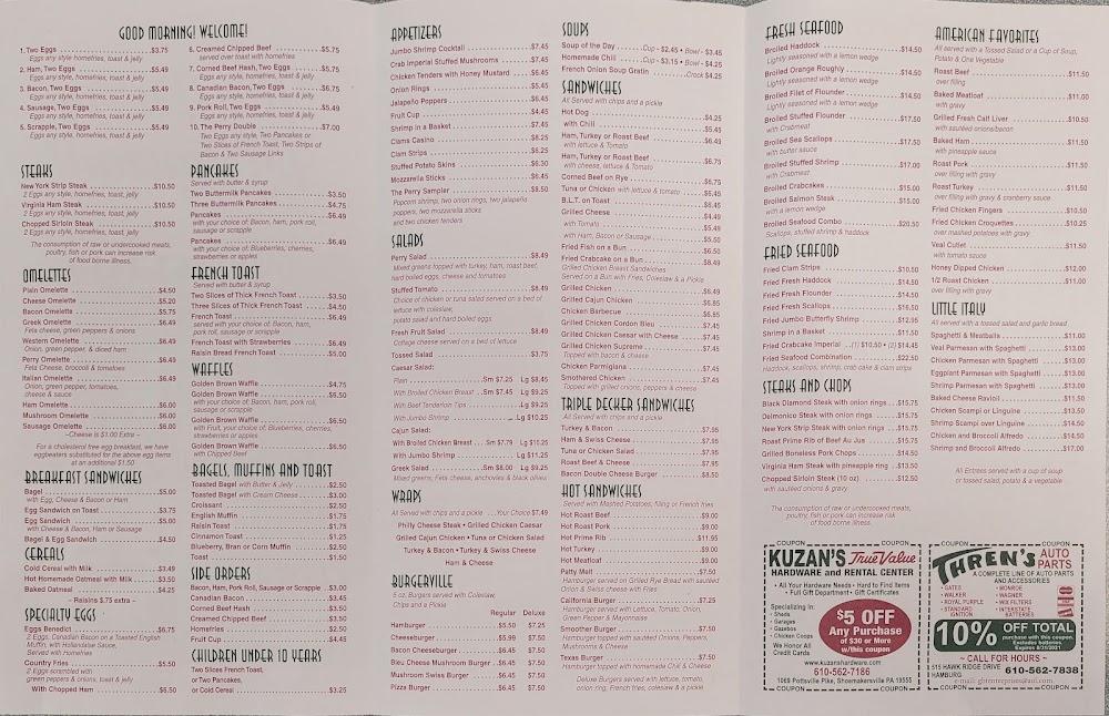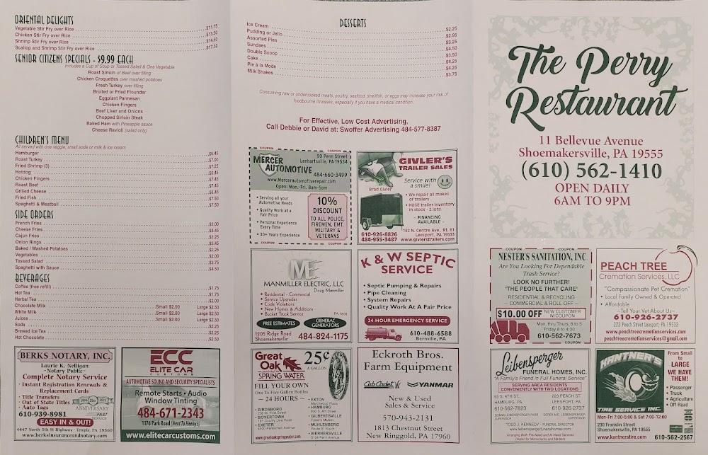 Welcome to Perry Restaurant, your go-to diner nestled in the heart of Shoemakersville, PA. Experience a cozy atmosphere perfect for families and solo diners alike, featuring an exceptional breakfast, lunch, and dinner menu that highlights local specialties. Enjoy our delicious coffee and delightful desserts in a relaxed setting. We prioritize accessibility for all guests, with wheelchair-accessible facilities and ample parking. Whether you’re dining in or opting for takeout, our friendly staff is here to provide a memorable experience. Join us for brunch or a quiet dinner, and taste the comfort of simple, traditional cuisine.